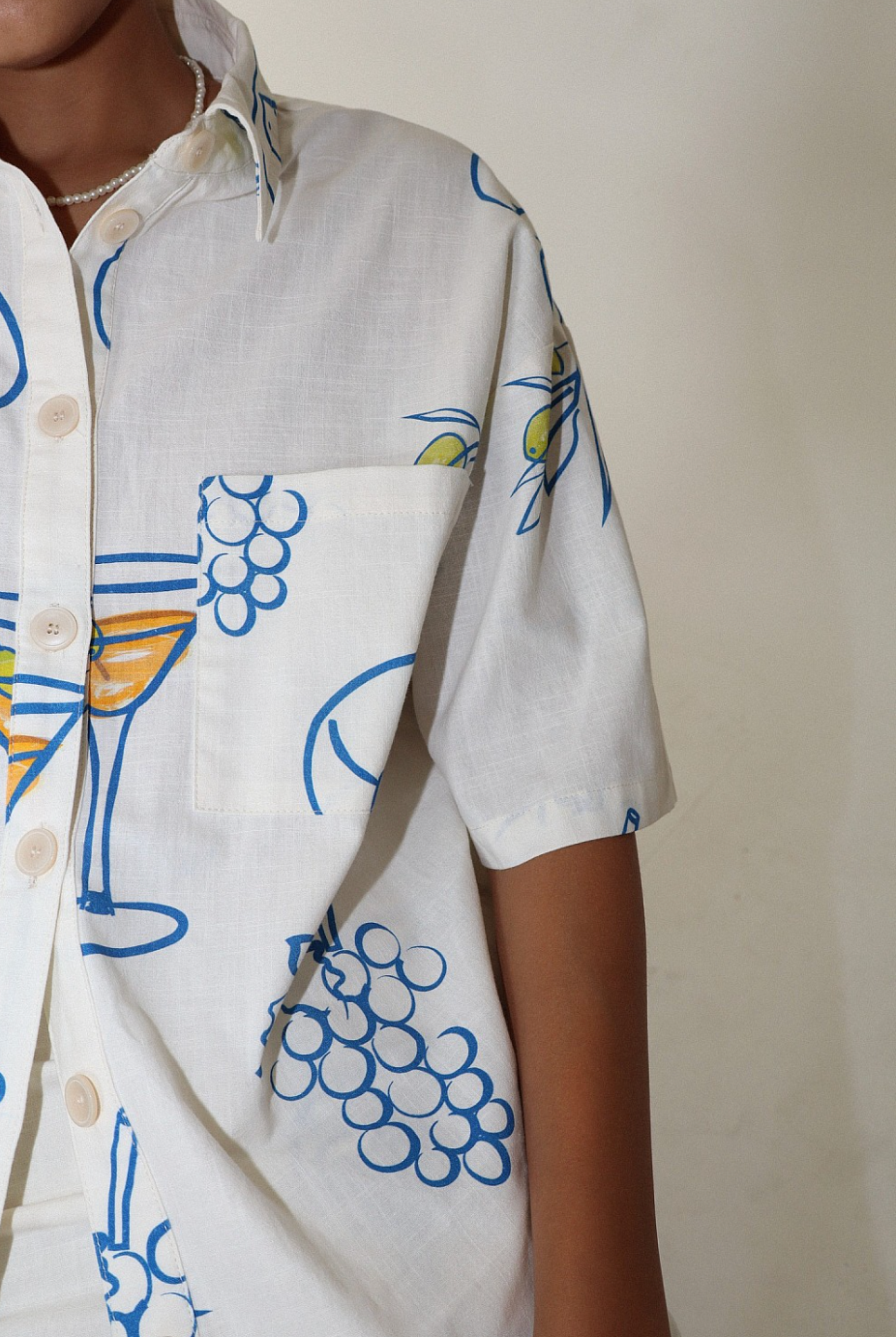 Elevate your summer style with our Cocktail Hour Button Down Shirt. This vibrant and whimsical print perfectly captures the carefree spirit of happy hour and warm summer nights. Complete the look by pairing it with our matching mini skirt.