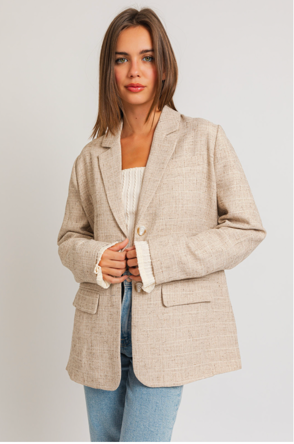 Update your professional wardrobe with the Kate Blazer! This trendy and lightweight blazer features a relaxed fit and a neutral color, making it perfect for both a stylish and professional look. Say goodbye to stuffy workwear and hello to effortless style with the Kate Blazer.