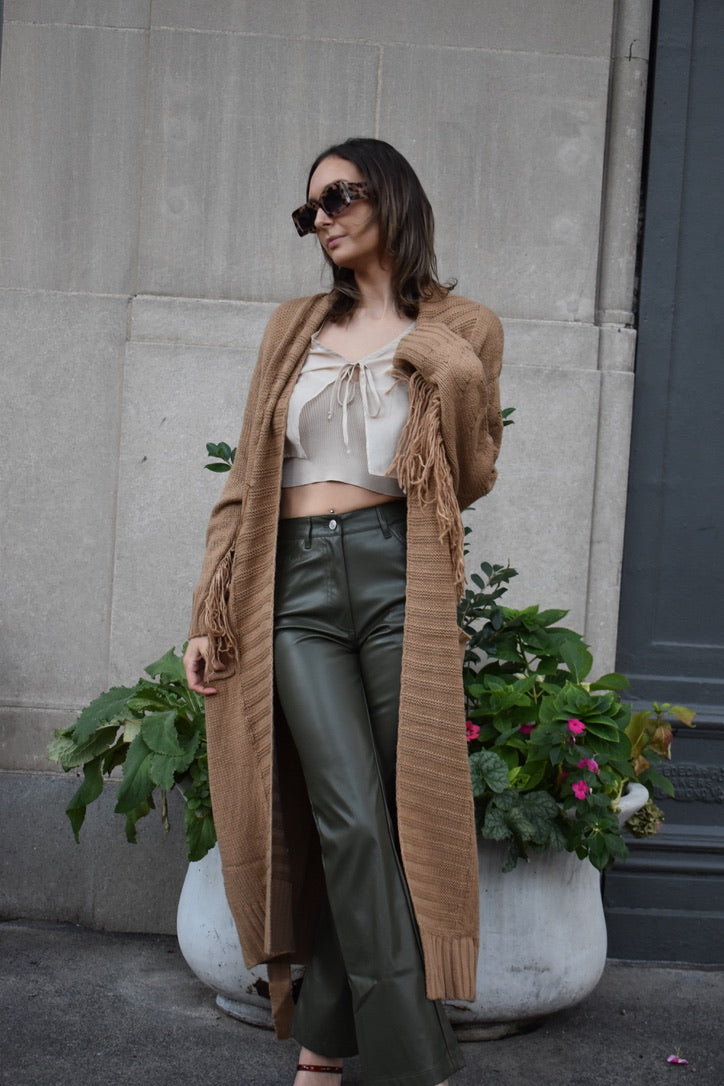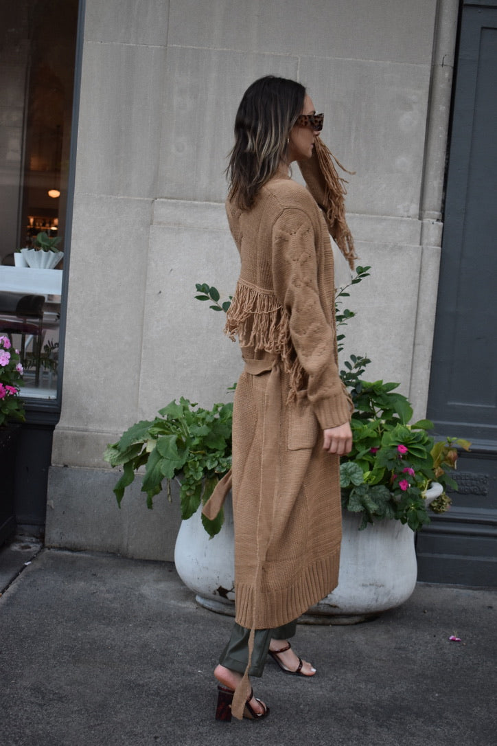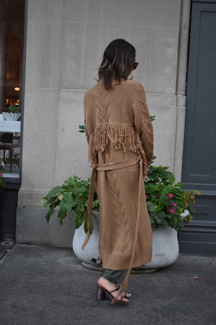 Wrap yourself in luxury and comfort with the Maya Cardigan. This dreamy cardigan features soft, cozy fabric and fringe detailing for a touch of elegance. Its neutral rust color will complement any outfit, and the removable belt adds versatility to your wardrobe. Say hello to your new favorite cardigan!