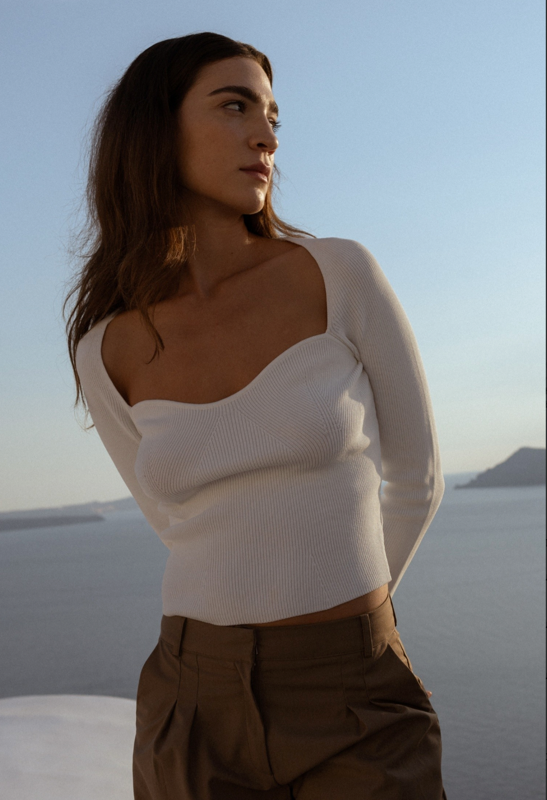 Update your wardrobe with the Mona Top, the elevated staple piece every closet needs. Featuring a stylish sweetheart neckline and impeccable detailing, this top is both versatile and unique. The neutral color adds sophistication while still standing out. A must-have for any fashion lover.