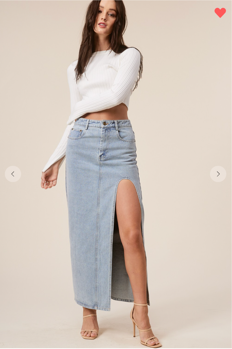 Elevate your style with the Stevie Skirt! This funky twist on a maxi denim skirt features a high leg slit for an edgy and stylish look. Perfect for any occasion, pair it with any top to make a statement. Don't miss out on this must-have addition to your wardrobe!